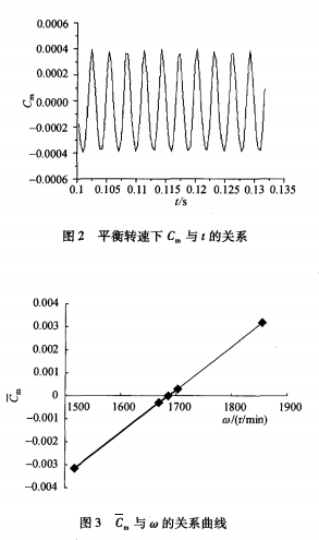 圖2即為葉輪在平衡轉速下旋轉時Cm的周期性變化過程。假定Cm為Cm值在一定計算時間內的平均值,計算時問通常約為一個葉輪軸的旋轉周期。通過計算發現,Cm基本上與葉輪轉速呈線性比例關係,見圖3。Cm等於零所對應的ω則表示葉輪在此轉速下旋轉達到了力矩平衡。因此在實際計算中,可以選取兩個轉速進行計算,建立Cm與ω的線性關係,然後利用此關係確定葉輪的平衡轉速。當然,預先能對葉輪處於平衡狀態下的轉速進行估計,縮小設定轉速與平衡轉速的範圍,利用這種方法確定葉輪平衡轉速的精確度將更加高。