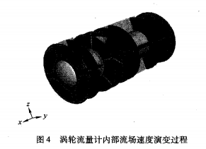 圖4示出了渦輪流量計沿旋轉軸方向上的速度演變過程。從圖中可以看到,當流體進人前導流件,由於流道麵積減少,流速增加。在前導流件後端,兩相鄰葉片之間流體速度分布已形成了環行通道中的速度剖麵,固體壁麵上存在邊界層。受葉片尾流的作用,流出導流件的流體在葉片後緣附近存在明顯的低速區。流體到達葉輪時,在自然耗散的作用下流速向均勻分布發展。緊靠葉輪葉片前緣,受葉輪旋轉的影響存在一個流體速度加速區,這將導致隨後的減速區內易發生流體分離現象。後導流件的流體速度演變則存在和前導流件相同的變化過程。