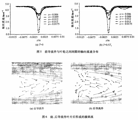 前導流件葉片後形成的尾流影響進人葉輪的速度分布,將導致葉輪葉片附近的流場分布很不均勻,*終影響葉輪的旋轉特性。圖5分別示出了在不同時間前導流件和葉輪之間間隙的不同橫截麵上軸向流速在半徑r=0.02m周向上的分布情況。T=0時,前導流件葉片正對葉輪葉片,T=0.5T1時(T1為葉輪軸的旋轉周期),前導流件葉片位於兩葉輪葉片的中間位置。從圖5中可以看到,尾流對速度剖麵的影響主要體現在尾流區速度分布的變形上。T=0.5T1時,緊挨葉片後緣(x=-0.0175m)正對尾流區的軸向流速僅為0.25m/s,而*高流速則為 4.5m/s。靠近葉輪,尾流區的流速逐漸增加,在葉輪前(x=-0.O06m)*低流速升高到了3.75m/s。從圖中同時可以看到,導流件葉片和葉輪葉片處於不同相對位置時,進入葉輪前流體速度分布情況並不一樣,主要區別在於靠近葉輪的橫截麵上。T=0時,受葉輪葉片的影響,x=-0.006m橫截麵上的*低流速則為3.25m/s。葉輪入口速度的周期性變化也是造成合力矩係數Cm**間發生周期性變化的直接原因。可以預見,前導流件葉片與葉輪葉片的距離越遠,葉輪的入口速度分布越均勻,Cm變化幅值越小,葉輪的旋轉穩定性越好。因此在設計中,在確保導流件的整流效果合理的設計結構前提下,應適當減少導流件葉片厚度以及增加導流件和葉輪之間的間距,以降低尾流對葉輪入口速度分布的影響。