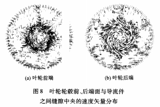 由圖8可以看到,葉輪輪轂前、後端麵與導流件之間縫隙中的流體受葉輪旋轉的影響而具有明顯的圓周運動。