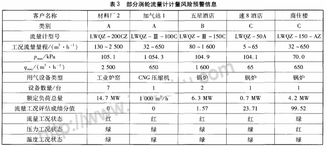 表3是建立渦輪流量計計量風險預警係統後,得到的部分渦輪流量計計量風險預警信息。